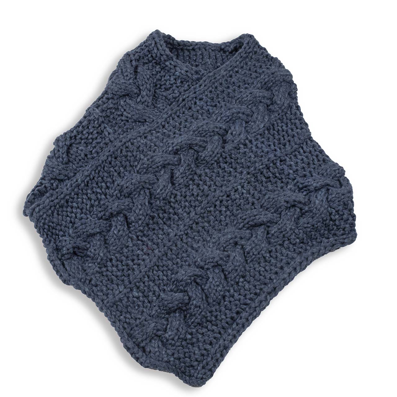 Πόντσο με πλεξούδες σε χρώμα μπλε αγκαλιάζει τους ώμους και με μύτη μπροστά.